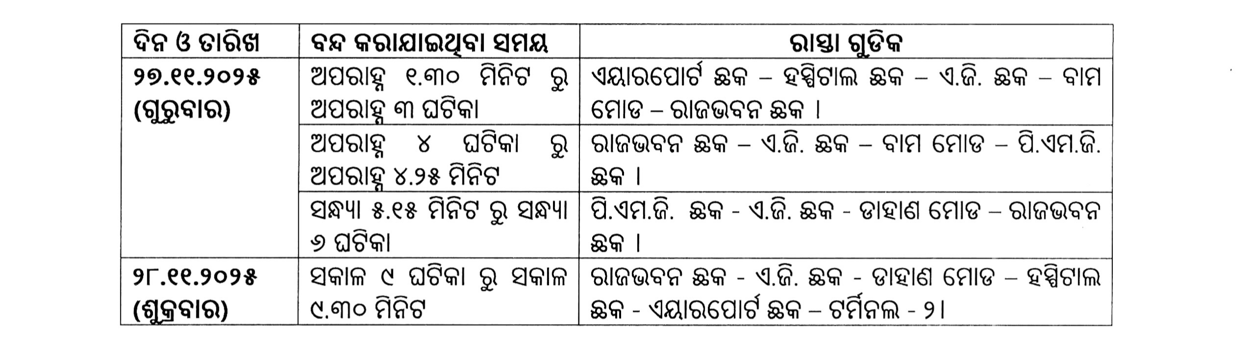 ଏହି ସମୟରେ କୌଣସି ଯାନବାହନ ଏହି ରାସ୍ତାରେ ଯାତାୟାତ କରିପାରିବେ ନାହିଁ କିମ୍ବା କୌଣସି ଗଳି ରାସ୍ତାରୁ ଏହି ରାସ୍ତାକୁ ଆସିପାରିବେ ନାହିଁ ।