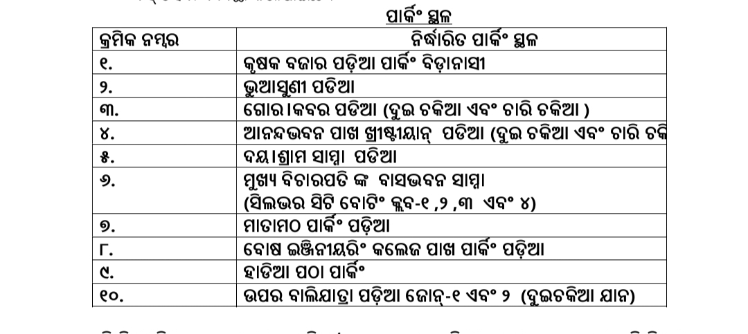 ସେହିପରି ଭୁବନେଶ୍ବରରୁ ନନ୍ଦନକାନନ, ବାରଙ୍ଗ, ତ୍ରିଶୁଳିଆ ଦେଇ ଆସୁଥିବା ହାଲୁକା ଯାନଗୁଡ଼ିକ ନେତାଜୀ ସେତୁ ଦେଇ ବେଲଭ୍ୟ ଛକ (ନ୍ୟାୟିକ ଏକାଡେମୀ)ଠାରୁ ବାମ ମୋଡ଼ ନେଇ ସିଡିଏ-୧୧ ଦେଇ ବିଜୁ ପଟ୍ଟନାୟକ ପାର୍କରେ ପହଞ୍ଚିବେ ଏବଂ ଭୂଆସୁଣୀ ଗ୍ରାଉଣ୍ଡ କିମ୍ବା କୃଷକ ବଜାର ଗ୍ରାଉଣ୍ଡରେ ସେମାନଙ୍କର ଯାନ ପାର୍କ କରିବେ ଏବଂ ସଟଲ୍ ବସ୍ ସେବା ମାଧ୍ୟମରେ ବାଲିଯାତ୍ରା ଗ୍ରାଉଣ୍ଡରେ ପହଞ୍ଚିପାରିବେ। ଆଠଗଡ଼ ଏବଂ ବାଙ୍କୀ ପାର୍ଶ୍ବରୁ ନରାଜ ସେତୁ ଏବଂ ମଧୁସୂଦନ ସେତୁ ଦେଇ ଆସୁଥିବା ହାଲୁକା ଯାନଗୁଡ଼ିକ ଭୂଆସୁଣୀ ଗ୍ରାଉଣ୍ଡ, ଗୋରକବର ଗ୍ରାଉଣ୍ଡ କିମ୍ବା ଖ୍ରୀଷ୍ଟିଆନ୍ ଗ୍ରାଉଣ୍ଡରେ ସେମାନଙ୍କର ଯାନ ପାର୍କ କରିପାରିବେ ଏବଂ ସଟଲ୍ ବସ୍ ସେବା ମାଧ୍ଯମରେ ବାଲିଯାତ୍ରା ଗ୍ରାଉଣ୍ଡରେ ପହଞ୍ଚିପାରିବେ।