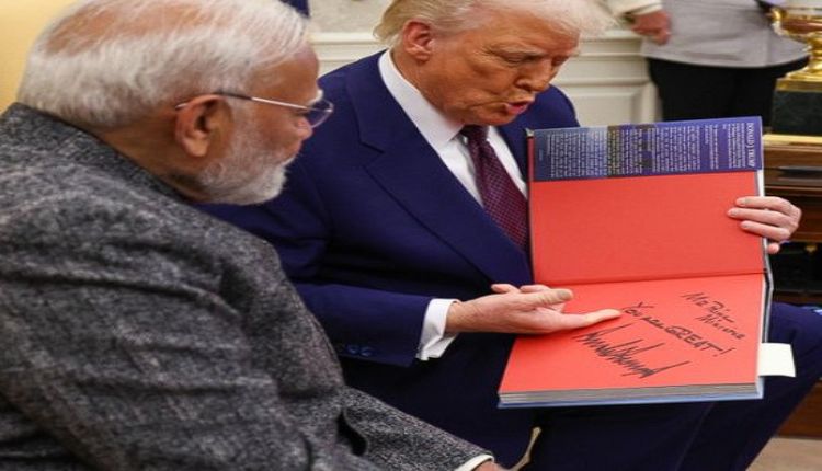 ୱାଶିଂଟନ: ଆମେରିକାରେ ପ୍ରଧାନମନ୍ତ୍ରୀ ନରେନ୍ଦ୍ର ମୋଦି। ହ୍ବାଇଟ ହାଉସରେ ରାଷ୍ଟ୍ରପତି ଡୋନାଲ୍ଡ ଟ୍ରମ୍ପଙ୍କୁ ଭେଟିବା ସହ ଦୁଇ ନେତାଙ୍କ ମଧ୍ୟରେ ବହୁ ଗୁରୁତ୍ବପୂର୍ଣ୍ଣ ଆଲୋଚନା ହୋଇଛି। ଭେଟଘାଟ ସମୟରେ ପ୍ରଧାନମନ୍ତ୍ରୀ ନରେନ୍ଦ୍ର ମୋଦିଙ୍କୁ ଏକ ବହି ଉପହାର ଦେଇଛନ୍ତି ଆମେରିକା ରାଷ୍ଟ୍ରପତି ଡୋନାଲ୍ଡ ଟ୍ରମ୍ପ।