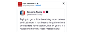 ଡୋନାଲ୍ଡ ଟ୍ରମ୍ପଙ୍କ ଏହି ପୋଷ୍ଟ ଏବେ ଇସ୍ରାଏଲ ଏବଂ ଲେବାନନ ମଧ୍ୟରେ ମଧ୍ୟ ଯୁଦ୍ଧବିରତିର ଆଶା ସୃଷ୍ଟି କରିଛି । ଟ୍ରମ୍ପ ଦାବି କରିଛନ୍ତି ଯେ, ଆସନ୍ତାକାଲି ୩୪ ବର୍ଷ ମଧ୍ୟରେ ପ୍ରଥମ ଥର ପାଇଁ ଦୁଇ ଦେଶର ନେତାଙ୍କ ମଧ୍ୟରେ ଶାନ୍ତି ଆଲୋଚନା ହେବାକୁ ଯାଉଛି । ଟ୍ରମ୍ପ ଏହାକୁ ଏକ ଭଲ ସଙ୍କେତ ବୋଲି କହିଛନ୍ତି ।