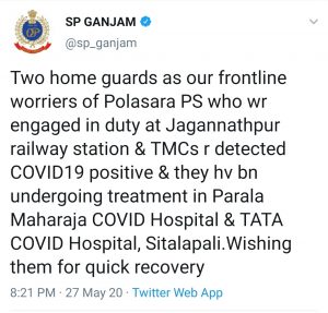 ବ୍ରହ୍ମପୁର: ଓଡିଶା ପୋଲିସ୍‌ର ଜଣେ ଜବାନ କୋଭିଡ୍‌୧୯ରୁ ସୁସ୍ଥ ହୋଇ ଫେରିଥିବା ବେଳେ ବୁଧବାର ଗଞ୍ଜାମ ଜିଲାର ପୋଲସରା ଥାନାର ଦୁଇଜଣ ହୋମ୍‌ଗାର୍ଡ କରୋନା ପଜିଟିଭ୍ ଚିହ୍ନଟ ହୋଇଥିବା ଜଣାପଡିଛି । ଏସମ୍ପର୍କରେ ଗଞ୍ଜାମ ଏସ୍‌ପିଙ୍କ ପକ୍ଷରୁ ଟୁଇଟର୍‌ରେ ସୂଚନା ଦିଆଯାଇଛି ।