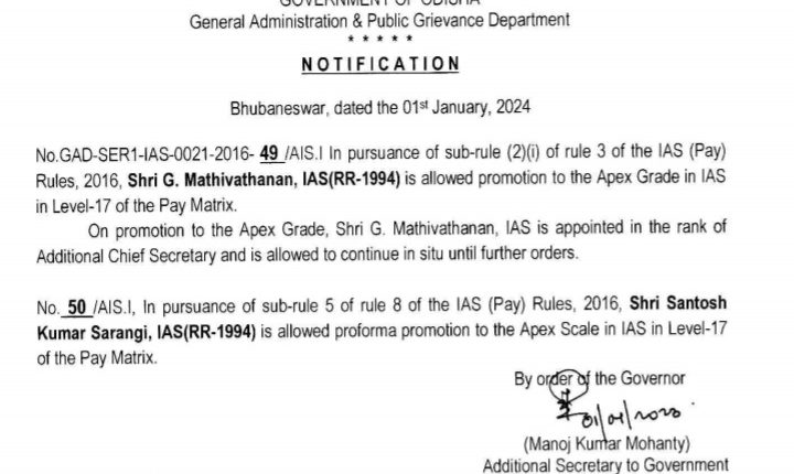 ଭୁବନେଶ୍ଵର; ରାଜ୍ୟ ସରକାରଙ୍କ ଦୁଇ ବରିଷ୍ଠ ଆଇଏଏସ ସ୍କେଲ୍ ୧୭କୁ ପଦୋନ୍ନତି ପଇଛନ୍ତି। ସେମାନେ ହେଉଛନ୍ତି ଓଡ଼ିଶା କ୍ୟାଡରର ଜି ମାଥିଭାଥନନ୍ ଏବଂ ସନ୍ତୋଷ ଷଢ଼ଙ୍ଗୀ।