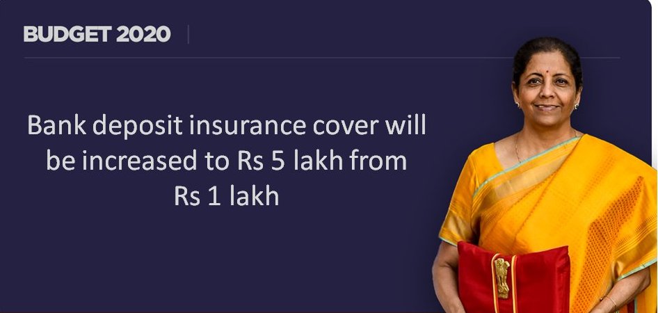 ପୂର୍ବରୁ ବ୍ୟାଙ୍କ ବୁଡିଗଲେ କିମ୍ବା ଦେବାଳିଆ ହୋଇଗଲେ ଏହାର ଖାତାଧାରକଙ୍କୁ ଇନସ୍ୟୁରାନ୍ସ ଗ୍ୟାରେଣ୍ଟି ଭାବେ ସର୍ବାଧିକ ୧ ଲକ୍ଷ ଟଙ୍କାର ଅର୍ଥରାଶି ସରକାରଙ୍କ ତରଫରୁ ମିଳୁଥିବା ବେଳେ ଚଳିତ ବଜେଟରେ ଏହାକୁ ୫ ଗୁଣ ବୃଦ୍ଧି କରାଯାଇଛି ।