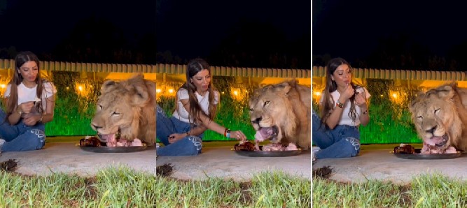 ଭାଇରାଲ ଭିଡିଓରେ ଦେଖିବାକୁ ମିଳିଛି ଯେ, ଦୁବାଇର ର୍ୟାକ ଚିଡ଼ିଆଖାନାରେ ଏକ ବିଶାଳ ସିଂହ ବସିଛି । ତା ପାଖରେ ଜଣେ ସୁନ୍ଦରୀ ଯୁବତୀ ବସିଛନ୍ତି । ସେମାନଙ୍କ ମଝିରେ ଏକ ଖାଦ୍ୟ ଥାଳି ରଖାଯାଇଛି । ଉଭୟ ସିଂହ ଓ ଯୁବତୀ ଖୁସିରେ ଗୋଟିଏ ଥାଳିରୁ ଖାଦ୍ୟ ଖାଉଛନ୍ତି । ଏହି ଦୃଶ୍ୟ ଦେଖିବା ପରେ ଲୋକେ ଆଶ୍ଚର୍ଯ୍ୟ ହୋଇଯାଇଛନ୍ତି । ଯେମିତି ଲାଗୁଛି ସିଂହ ଯୁବତୀଙ୍କର ଗୋଟେ ପୋଷା ପଶୁ ।
