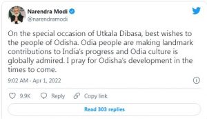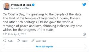ଉତ୍କଳ ଦିବସ ୨୦୨୨ : ଓଡିଶାବାସୀଙ୍କୁ ଅଭିନନ୍ଦନ ଜଣାଇଲେ ରାଷ୍ଟ୍ରପତି ରାମନାଥ କୋବିନ୍ଦ ଓ ପ୍ରଧାନମନ୍ତ୍ରୀ ମୋଦି