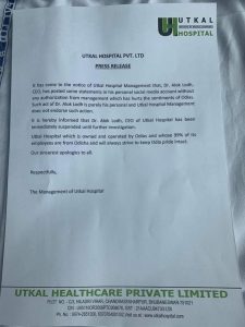 ଏହା ସହ ଉତ୍କଳ ହସପିଟାଲ ମଧ୍ୟ ସ୍ପଷ୍ଟିକରଣ ଦେଇ ତାଙ୍କୁ ନିଲମ୍ବନ କରାଯାଇଥିବା ପ୍ରେସ ବିଜ୍ଞପ୍ତି ପ୍ରକାଶ କରିଛି ।