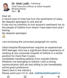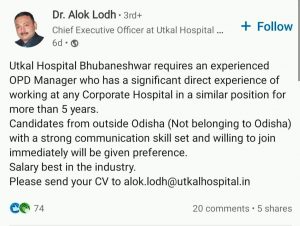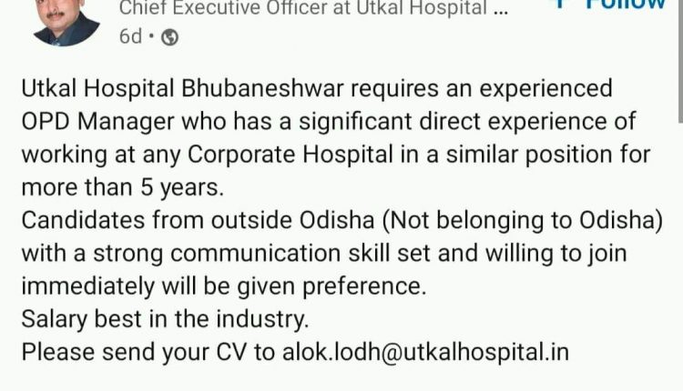 ଏଠରେ ସୂଚନାଯୋଗ୍ୟ, ମୁଖ୍ୟ କାର୍ଯ୍ୟନିର୍ବାହୀ ଅଧିକାରୀ(ସିଇଓ) ଆଲୋକ ଲୋଧ ଟ୍ବିଟର୍ରେ କରିଥିବା ପୋଷ୍ଟରେ ଲେଖିଥିଲେ ଯେ ଉତ୍କଳ ହସ୍ପିଟାଲ୍ ପାଇଁ ଜଣେ ଓପିଡି ମ୍ୟାନେଜରଙ୍କ ଆବଶ୍ୟକତା ରହିଛି। କୌଣସି କର୍ପୋରେଟ୍ ହସ୍ପିଟାଲରେ ୫ ବର୍ଷରୁ ଊର୍ଦ୍ଧ୍ବ ଅଭିଜ୍ଞତା ଥିବା ବ୍ୟକ୍ତି ଏଥିପାଇଁ ଆବେଦନ କରିପାରିବେ। ତେବେ ସେ ସ୍ପଷ୍ଟ କରିଥିଲେ ଯେ ଆବେଦନକାରୀ ଅଣଓଡ଼ିଆ ଅର୍ଥାତ୍ ଓଡ଼ିଶା ବାହାରର ହୋଇଥିବା ଦରକାର।