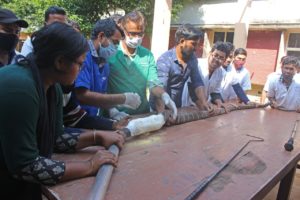 ପ୍ରଥମେ ପ୍ଲାଷ୍ଟର୍ କରିବା ପାଇଁ ଏକ ୩ ଇଞ୍ଚ ମୋଟେଇ ପିଭିସି ପାଇପକୁ ଆରି ପାତ ସାହାଯ୍ୟରେ ସ୍ନେକ ହେଲ୍ପ ଲାଇନ ସଦସ୍ୟ ମାନେ କାଟି ଦୁଇଭାଗ କରିଥିଲେ । ଏହା ପରେ ସେହି ଦୁଇ ଫାଳ ପାଇପର ଭିତର ପଟେ ତୁଳା ଓ ମାଇକ୍ରୋପୋର ବ୍ୟାଣ୍ଡେଜ୍ ସାହାଯ୍ୟରେ ପ୍ୟାଡିଙ୍ଗ ଦିଆଯାଇ ନରମ ଗଦି ପରି ବ୍ୟବସ୍ଥା କରାଯାଇଥିଲା । ଯେମିତି କି ସାପ ଦେହରେ କଠିନ ପ୍ଲାଷ୍ଟିକ ପାଇପ ଘଷି ହୋଇ କ୍ଷତ ହେବନାହିଁ ।
