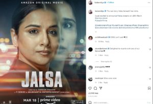 ଏହା ପୂର୍ବରୁ ନିର୍ଦ୍ଦେଶକ ସୁରେସ ତ୍ରୀବେଣୀ ‘ତୁହ୍ମାରୀ ସଲ୍ଲୁରେ’ ବିଦ୍ୟା ବାଲନଙ୍କ ସଙ୍ଗେ କାମ କରି ସାରିଛନ୍ତି । ୧୮ ମାର୍ଚ୍ଚରେ ‘ଜଲସା’ର ପିମିୟମ ରିଲିଜ ହେବ । ଡ୍ରାମା ଏବଂ ରୋମାଞ୍ଚକ କାହାଣି ଉପରେ ଆଧାରିତ ଏହି ଫିଲ୍ମ ଆମାଜନ ପ୍ରାଇମରେ ରିଲିଜ ହେବ । ଏହି ମୁଭିଟି ଦର୍ଶକଙ୍କୁ ମନକୁ ବେଶ୍ ଛୁଇଁବ ବୋଲି ଆଶା ରଖିଛନ୍ତି ପୁରା ଟିମ୍ ।