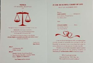 ଓକିଲ ଅଜୟ ଶର୍ମା ଓ ପୂଜା ଶର୍ମା ନିଜ ନିମନତ୍ରଣ ପତ୍ରରେ ଇନଭିଟେସନ୍ ବଦଳରେ ନୋଟିସ୍ ଅଫ୍ ୱେଡିଂ ରିସେସ୍ପନ୍ ଲେଖିଛନ୍ତି । ନିମନ୍ତ୍ରଣ ପତ୍ରକୁ ଲିଗାଲ୍ ନୋଟିସ୍ ହିସାବରେ ପ୍ରସ୍ତୁତ କରି ନିଜ ସାଙ୍ଗ, ସାଥୀ କର୍ମଚାରୀ ତଥା ବନ୍ଧୁବାନ୍ଧବଙ୍କୁ ପ୍ରେରଣ କରିଛନ୍ତି । ସୋସିଆଲ ମିଡିଆରେ ଏହି ନିମନ୍ତ୍ରଣ ପତ୍ର ଖୁବ ଭାଇରାଲ୍ ହୋଇଥିଲାବେଳେ ଆଇନଜୀବୀ ଦମ୍ପତ୍ତିଙ୍କ କ୍ରିଏଟିଭିଟିକୁ ସମସ୍ତେ ତାରିଫ କରିଛନ୍ତି ।