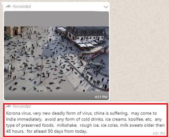 ହ୍ୱାଟ୍ସଆପ୍ରୁ ସ୍ନାପସଟ୍ ନିଆଯାଇଥିବା ଏହି ଫଟୋରେ ସ୍ପଷ୍ଟ ଭାବେ ଲେଖାହୋଇଛି, ଚାଇନାରେ ମରିପଡିଛନ୍ତି ଶହଶହ ଲୋକ । କରୋନାଭାଇରସ୍ ଖୁବଶୀଘ୍ର ଭାରତ ଆସୁଛି । ଏପରିକି କୌଣସି ଫ୍ରୋଜେନ୍ ଫୁଡ୍ ନଖାଇବାକୁ ମଧ୍ୟ ତାଗିଦ୍ କରାଯାଇଛି ।