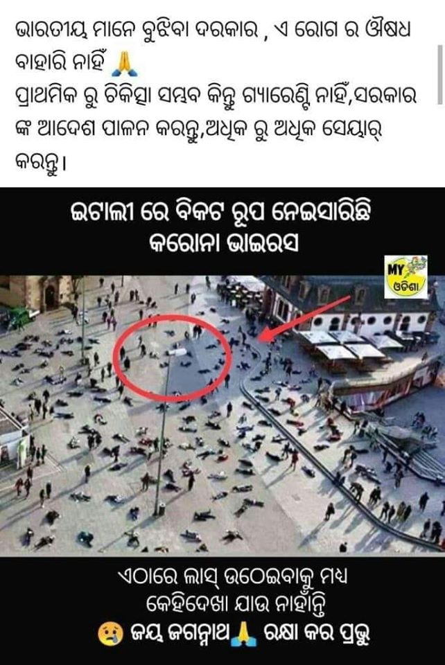 ଏବେ ଓଡିଶାରେ ଭାଇରାଲ୍ ହୋଇଥିବା ଏହି ଫଟୋ ଉପରେ ଟିକେ ନଜର ପକାନ୍ତୁ । ଚାଇନା ନୁହେଁ ବରଂ ଏହି ଫଟୋଟି ଓଡିଶାରେ ଇଟାଲୀ ଭାବେ ଭାଇରାଲ୍ ହୋଇଥିଲା । ଲୋକେ ଏହି ପୋଷ୍ଟକୁ ଶେୟାର କରିବା ସହ କୋଭିଡ୍-୧୯ର ପ୍ରାଥମିକ ଚିକିତ୍ସା ନଥିବା କହି ଭାଇରାଲ୍ କରିଥିଲେ ।