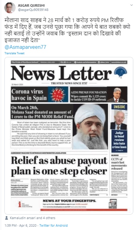 ଟୁଇଟ୍ରେ କ୍ୟାପ୍ସନ୍ ଥିଲା “୨୮ ମାର୍ଚ୍ଚରେ ମୌଲାନା ଅସାଦ ପିଏମ୍ ରିଲିଫ ପାଣ୍ଠିକୁ କୋଟିଏ ଟଙ୍କା ଦେଇଥିଲେ । ହେଲେ ଇସଲାମ୍ ଦେଖାଣିଆପଣକୁ ପ୍ରଶ୍ରୟ ଦିଏନି” । ଏହି ଖବରଟି ଟୁଇଟର ଓ ଫେସବୁକରେ ତୀବ୍ର ଗତିରେ ଭାଇରାଲ୍ ହୋଇଥିଲା ।