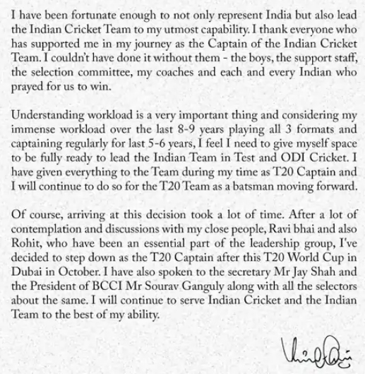 ମୁଁ ଗତ ୯ ବର୍ଷ ଧରି ସମସ୍ତ ଫର୍ମାଟରେ ଦଳର ନେତୃତ୍ୱ ନେଇ ଆସୁଛି । କାର୍ଯ୍ୟଭାର ଯୋଗୁ ମୁଁ ଚାପରେ ରହୁଛି । ଏବେ ନିଜକୁ କିଛି ସମୟ ଦେବାକୁ ଚାହୁଁଛି ବୋଲି ଲେଖିଛନ୍ତି । ଭାରତର ପ୍ରତିନିଧିତ୍ୱ କରିବା ମୋ ପାଇଁ ଗର୍ବର ବିଷୟ । ଯେଉଁମାନେ ସହଯୋଗ କରିଛନ୍ତି ସେମାନଙ୍କୁ ମୁଁ ଧନ୍ୟବାଦ ଦେଉଛି । ରୋହିତ ଶର୍ମା ଟି୨୦ ଅଧିନାୟକ ଦୌଡରେ ଆଗରେ ରହିଛନ୍ତି ।