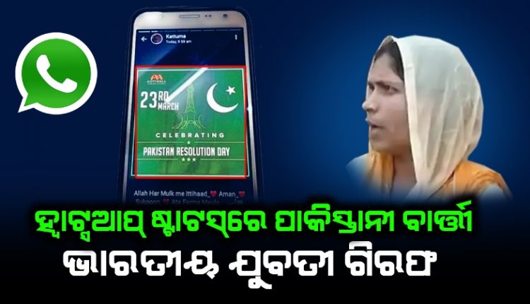 ଭୁବନେଶ୍ୱର: ପାକିସ୍ତାନର ଗଣତନ୍ତ୍ର ଦିବସର ପ୍ରଚାରପ୍ରସାର କରି ଜଣେ ଭାରତୀୟ ଯୁବତୀ ଗିରଫ ହୋଇଛନ୍ତି । ହ୍ୱାଟ୍ସଆପ୍ ଷ୍ଟାଟସ୍କୁ ନେଇ ସଂପୃକ୍ତ ଯୁବତୀଙ୍କ ବିରୋଧରେ ଥାନାରେ ଅଭିଯୋଗ ହେବା ପରେ ପୋଲିସ ତୁରନ୍ତ କାର୍ଯ୍ୟାନୁଷ୍ଠାନ ଗ୍ରହଣ କରିଛି ।