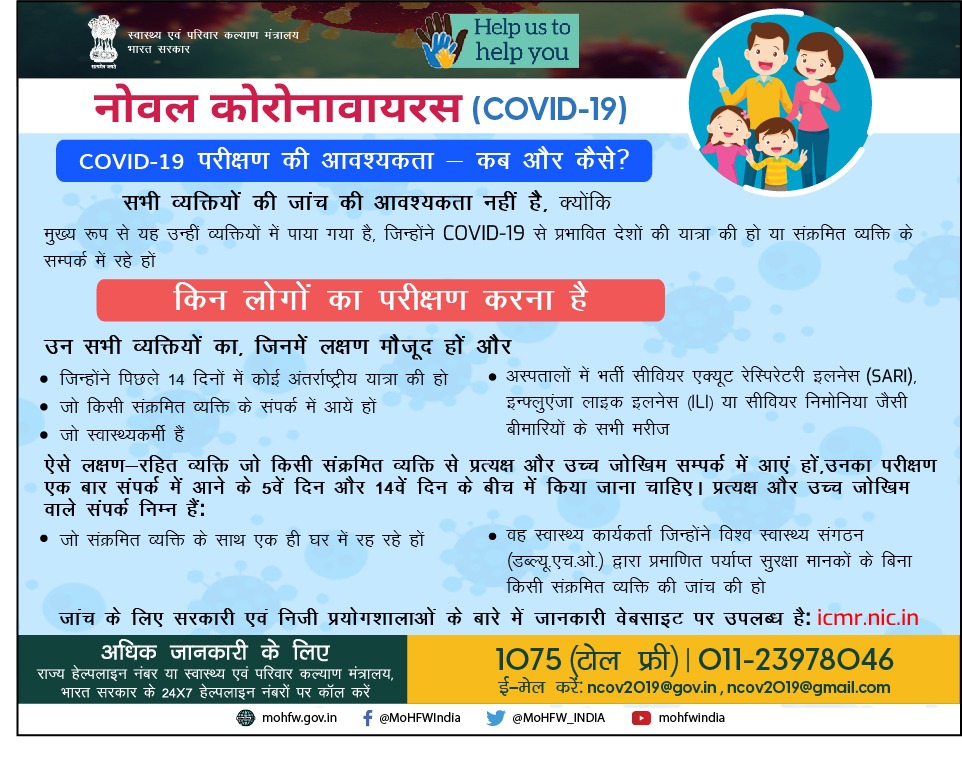 ନୂଆଦିଲ୍ଲୀ: ସମସ୍ତ ଲୋକଙ୍କୁ କୋଭିଡ-୧୯ ପରୀକ୍ଷା କରାଇବାର ଆବଶ୍ୟକତା ନାହିଁ । ମୁଖ୍ୟତଃ ସେହି ବ୍ୟକ୍ତିଙ୍କୁ ଦରକାର, ଯେଉଁମାନେ କୋଭିଡ-୧୯ ପ୍ରଭାବିତ ଦେଶରୁ ଯାତ୍ରା କରିଛନ୍ତି କିମ୍ବା କରୋନା ସଂକ୍ରମିତ ବ୍ୟକ୍ତିଙ୍କ ସମ୍ପର୍କରେ ଆସିଛନ୍ତି ।