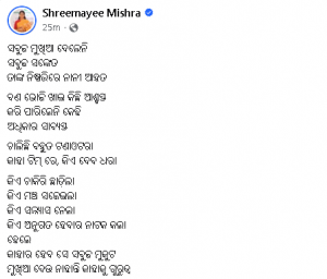 କିଏ କାହା ଟିମ୍ରେ ରହିବ ତାକୁ ନେଇ ଚାଲିଛି ଟଣାଓଟରା । ବିଜେଡି ମୁଖିଆ କାହାକୁ ଗୁରୁତ୍ଵ ଦେଉନଥିବା ନେଇ ଶ୍ରୀମୟୀ ବ୍ୟଙ୍ଗ କବିତା ଲେଖିଛନ୍ତି । କାହାର ହେବ ସବୁଜ ମୁକୁଟ, ମୁଖିଆ ଦେଉନାହାନ୍ତି କାହାକୁ ଗୁରୁତ୍ଵ । ବଣ ଭୋଜି ଖାଇ କିଛି ଆଶ୍ବସ୍ତ, ଅଧିକାର ସାବ୍ୟସ୍ତ ପାଇଁ ଟଣାଓଟରା । କାହା ଟିମ୍ରେ କିଏ ଦେବ ଧରା, କିଏ ଅନୁଗତ ହେବାର ନାଟକ କଲା । ବିଜେଡିର ଉତ୍ତରାଧିକାରୀ ନେଇ ମୁଖିଆ ଦେଲେନି ସବୁଜ ସଙ୍କେତ ବୋଲି ଶ୍ରୀମୟୀ କଟାକ୍ଷ କରିଛନ୍ତି ।