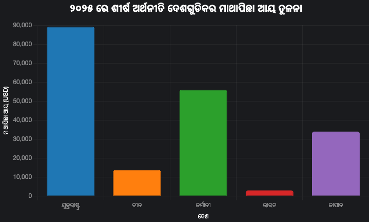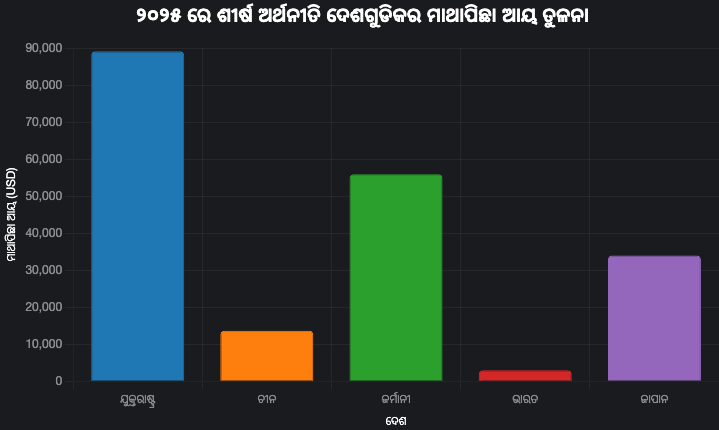 • ତୁଳନା: ଚୀନର ମୁଣ୍ଡପିଛା ଆୟ ଭାରତର ତୁଳନାରେ ପ୍ରାୟ ୪ ଗୁଣ ଅଧିକ, ଯଦିଓ ଏହାର ଜନସଂଖ୍ୟା ମଧ୍ୟ ବିଶାଳ (୧.୪୦୫ ବିଲିୟନ)। ଚୀନର ଦ୍ରୁତ ଶିଳ୍ପୀକରଣ ଓ ରପ୍ତାନି-କେନ୍ଦ୍ରିତ ଅର୍ଥନୀତି ଏହାର ବ୍ୟକ୍ତି କେନ୍ଦ୍ରିକ ଆୟ ବୃଦ୍ଧିରେ ସହାୟକ ହୋଇଛି।
