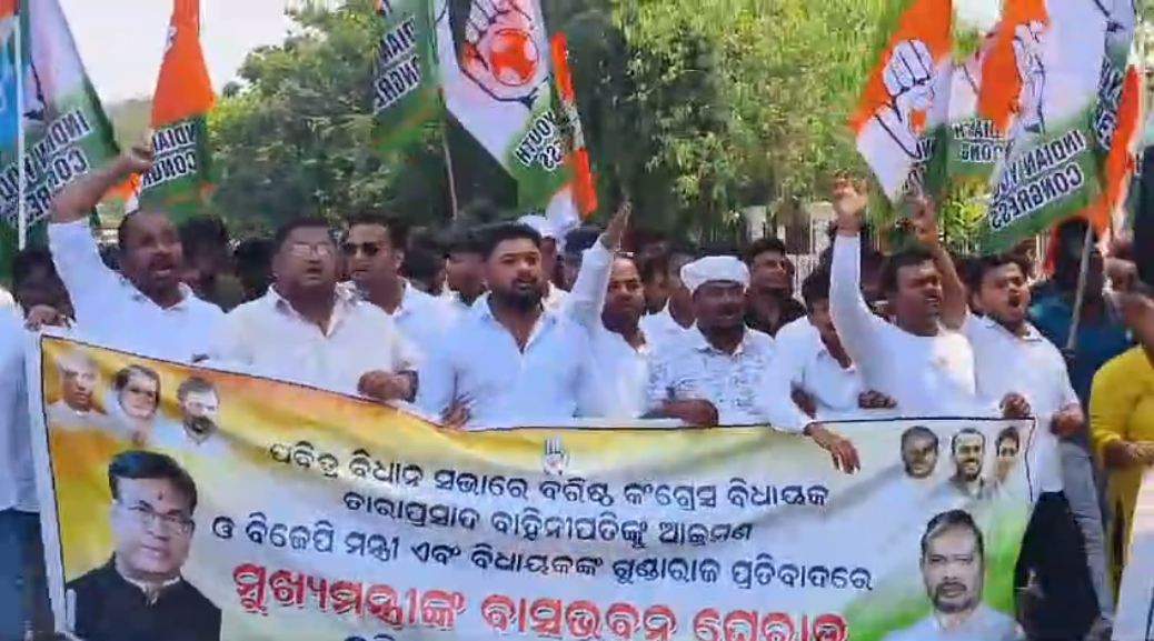 ଭୁବନେଶ୍ବର: ଆଜି ସଂସଦୀୟ ବ୍ୟାପାର ମନ୍ତ୍ରୀ ତଥା ସ୍ବାସ୍ଥ୍ୟ ମନ୍ତ୍ରୀ ମୁକେଶ ମହାଲିଙ୍ଗଙ୍କୁ ନିଲମ୍ବନ କରିବା ଦାବିରେ ପ୍ରତିବାଦ କରି ମୁଖ୍ୟମନ୍ତ୍ରୀଙ୍କ ବାସଭବନ ଆଡେ ମୁହାଁଇଥିଲା ଯୁବ କଂଗ୍ରେସ । ହେଲେ ଅଧା ବାଟରୁ ହିଁ ଉଠାଇ ନେଇଥିଲା ପୋଲିସ୍ ।