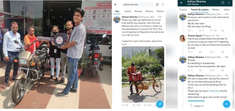 ଭିଲାୱାଡା: ରାଜସ୍ଥାନର ଭିଲାୱାଡାର ୧୮ ବର୍ଷୀୟ ଆଦିତ୍ୟ ଶର୍ମା ଜୋମାଟୋରେ କୋଲ୍ଡ ଡ୍ରିଙ୍କସ ଅର୍ଡର ଦେଇଥିଲେ । ଏହାର ଡେଲିଭର ବୟ ପ୍ରଚଣ୍ଡ ଖରା (୪୨ ଡିଗୀ)ରେ ସାଇକେଲ ଚଲାଇ ଏହାକୁ ଆଣି ଦେଇଥିଲା । ଏହା ଦେଖି ଆଦିତ୍ୟଙ୍କ ମନ ତରଳିଗଲା । ସେ ଡେଲିଭର ବୟ ସହ କଥା ହେବାକୁ ଜାଣିପାରିଲା ଯେ, ସେ ଜଣେ ଏମଏ ପାସ ଯୁବକ । କରୋନା ମହାମାରୀ ପୂର୍ବରୁ ଶିକ୍ଷକତା କରି ପରିବାର ଚଳାଉଥିଲେ । କରୋନା ଯୋଗୁ ତାଙ୍କ ଚାକିରୀ ଚାଲି ଯାଇଥିଲା । ଶେଷରେ ସେ ପେଟ ପୋଷିବା ପାଇଁ ଏହି ପନ୍ଥା ଆପଣାଇଥିଲେ । ଏହା ସବୁ ଶୁଣିବା ପରେ ଆଦିତ୍ୟ ତାଙ୍କ ପାଇଁ ବାଇକ କିଣିବା ପାଇଁ ଉଦ୍ୟମ କରିଥିଲେ । ସେ ଟୁଇଟରରେ ଏହାକୁ ଶେୟାର କରି ଫଣ୍ଡ ପାଇଁ ଅନୁରୋଧ କରିଥିଲେ । ୨ ଘଂଟା ମଧ୍ୟରେ ୧.୯୦ ଲକ୍ଷ ଟଙ୍କା କଲେକ୍ସନ ହୋଇଥିଲା ।